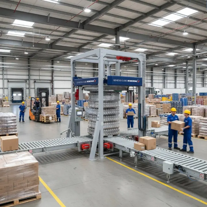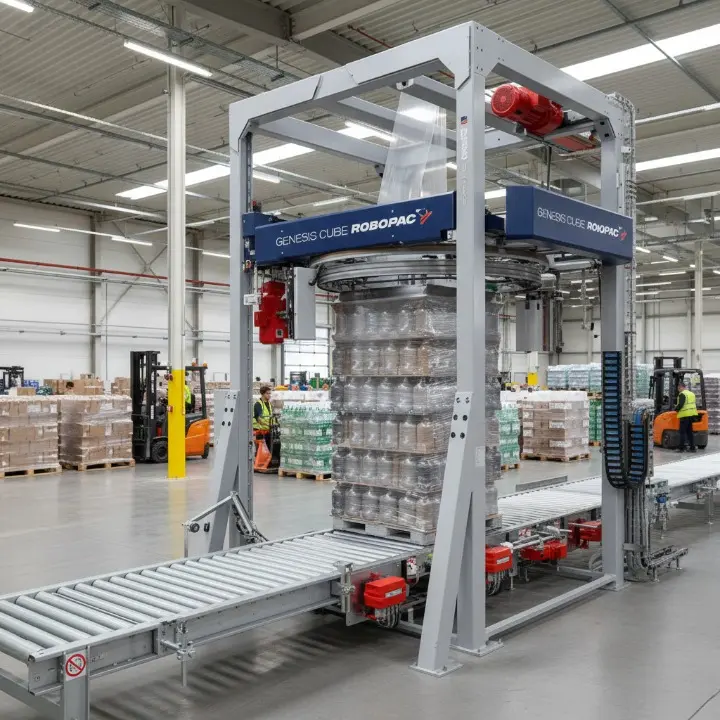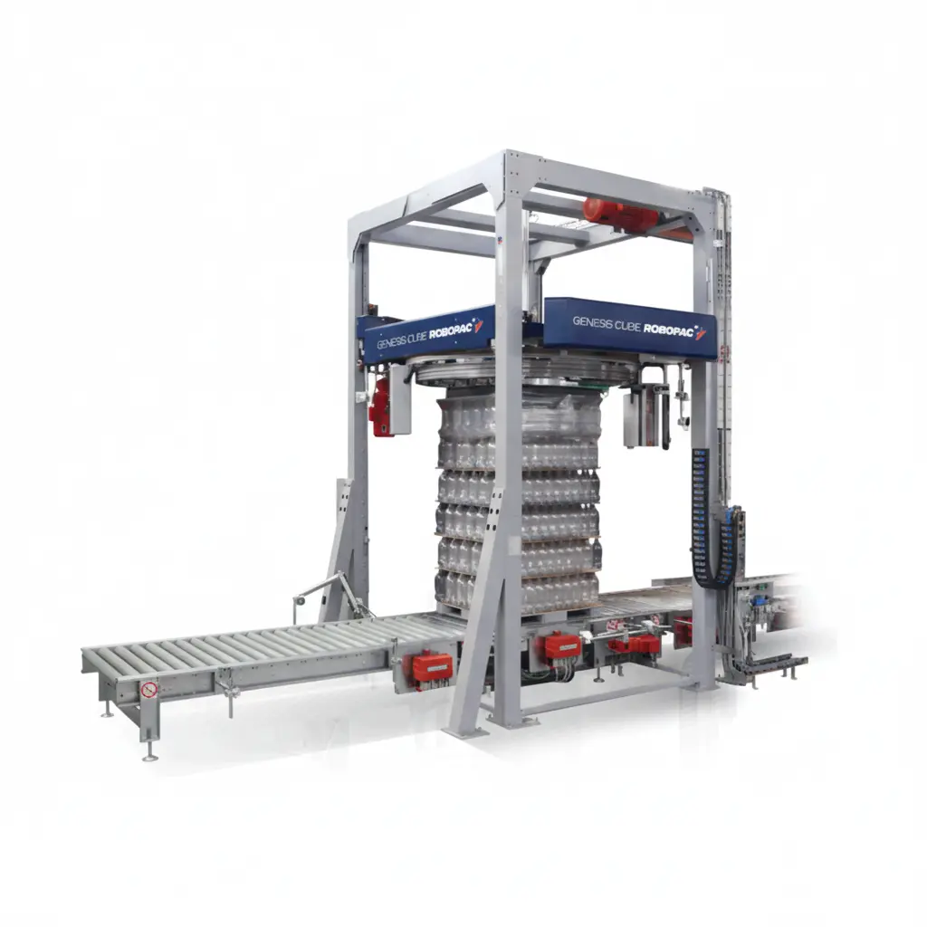 Envolvedora de nueva generación para envolver y estabilizar cargas sobre palets con film extensible, Genesis Cube nace del desarrollo de las anteriores máquinas de anillo de Robopac Sistemi y funciona también sin contactos eléctricos deslizantes, garantizando seguridad, reducción del peso global y equilibrio de las masas rotantes.