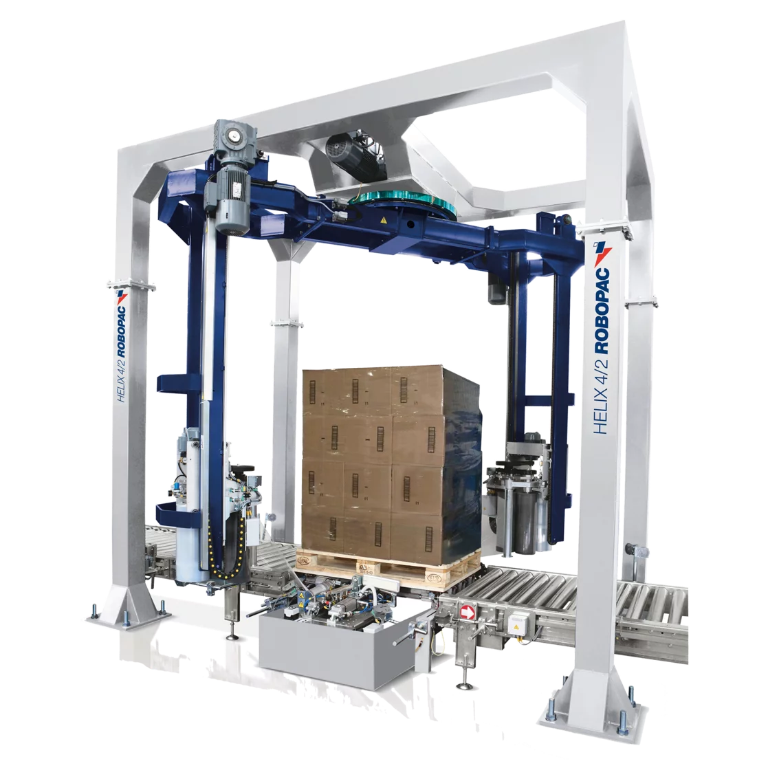 Envolvedora automática con doble brazo giratorio, para responder a las necesidades de estabilización de las cargas en palets en caso de frecuencias por hora elevada.