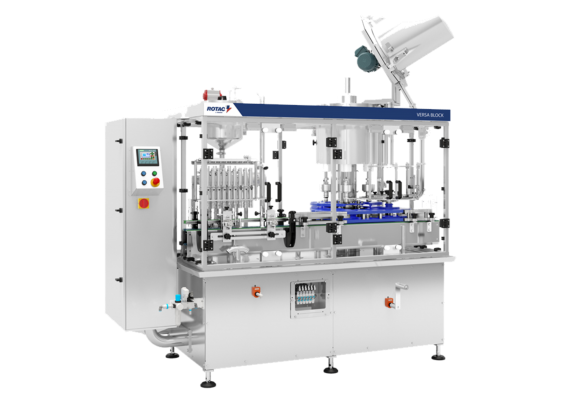 Es un equipo monobloque capaz de efectuar varios procesos de automación mecánica en un único y compacto bloque, desarrollado para envasar frascos a través del sistema de dosificación volumétrico y cierre rotativo, con selección de tapas automática.